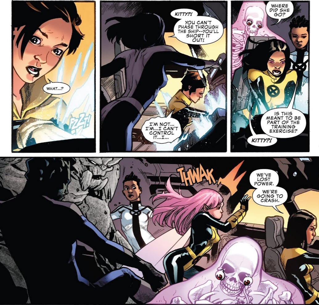 While the Class flies over Morrisville, North Carolina in the Blackbird, Pryde goes over the mission details with the class while some were vocal about their disappointment in choosing a villain to face but like Kitty tries to teach them “Every mission is an opportunity to learn something.” As they began to get ready to land, she started to phase through the controls, the class panicking as their teacher disappeared leaving them to pilot the jet before it crashed into the building, causing a massive explosion. (Better contact Acme CrimeNet, might give Carmen Sandiego a run for her money!)