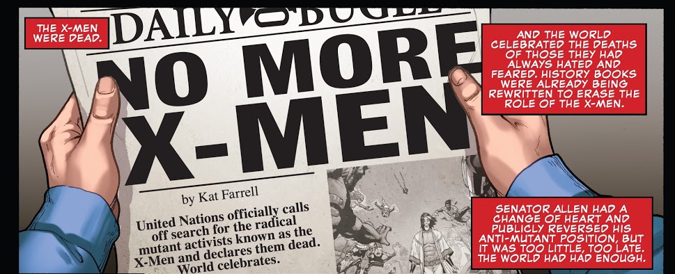 Could have been a simple Battle, between two powerful mutants with their teams, but that wasn’t the case when Nate took over Legion via Psychic Possession! With the help of every psychic, that was on hand in the battle helping Jean battle Nate, infiltrating his mind and forcing him to separate from Legion, with X-Man’s last ounce of power he destroyed all of the X-Men! With the X-Men gone, the narration is vague and this gave the Anti-Mutant activists what they had been asking for. With the return of Cyclops, we see him trying to put the pieces back together, and a plan to undo the apparent psychic genocide that Nate unleashed.