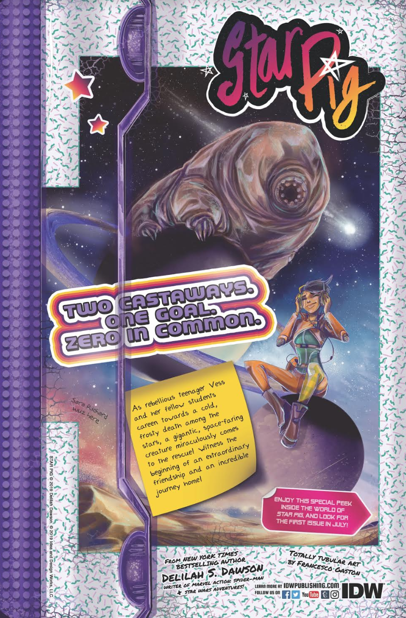 Sounds strange, right? IDW announced that it would be making a new Sci-Fi comic, with Writer Delilah S. Dawson and art by Francesco Gaston, the story involves a 21-year-old girl who gets shoved off to spend her Summer Break at an Orbital Space Camp, but tragedy strikes when a shuttle accident sends her and the crew into the cold void of space! But a mysterious Gigantic Cosmic WatWaterer Bear saves her and Retro Discman, begins an extraordinary friendship and a journey set to Vess’s 90s tunes.