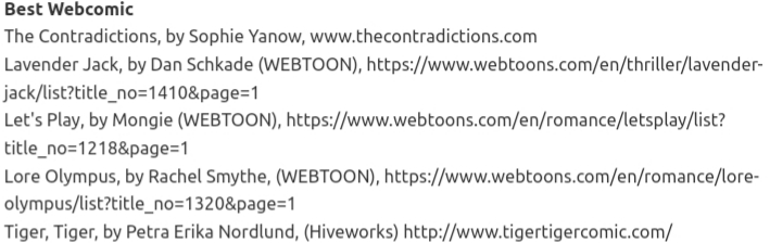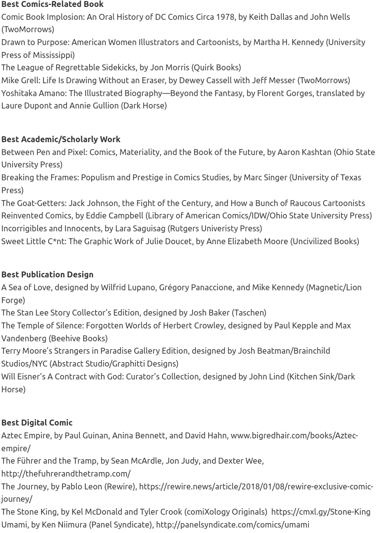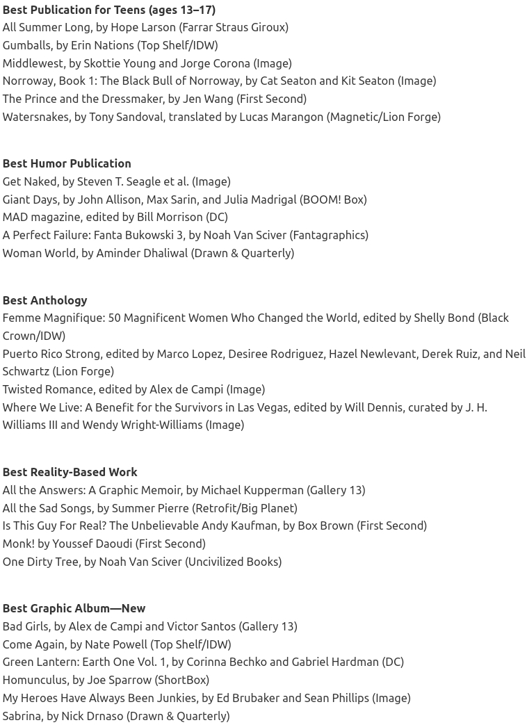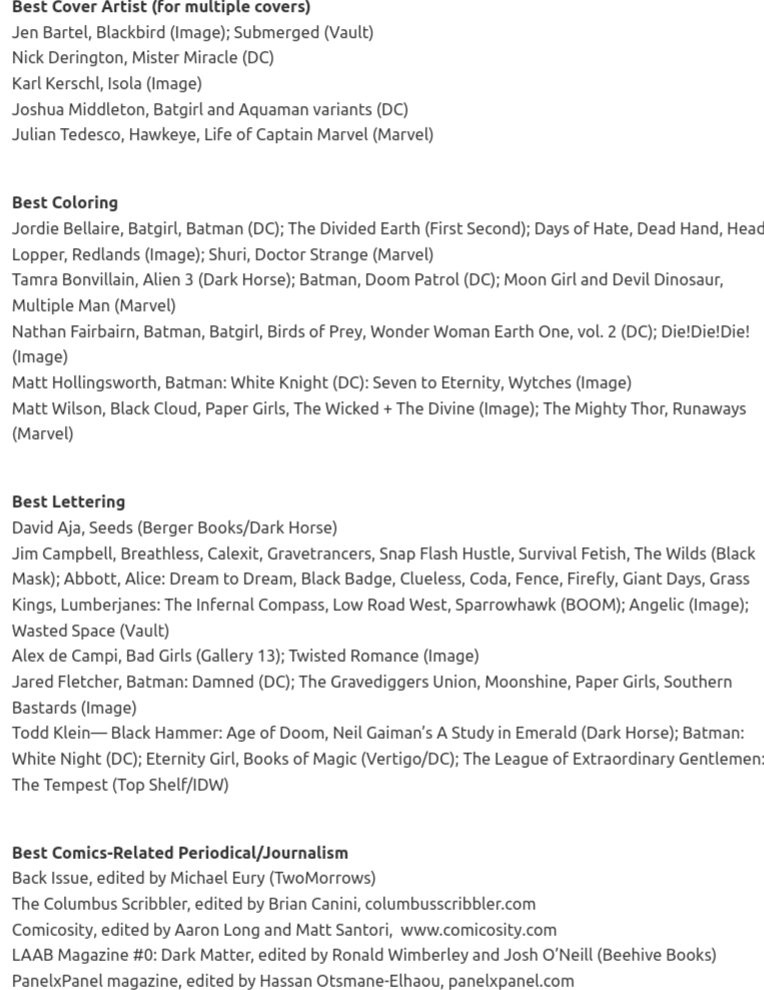 Again, DC and Image received most of the nominations: Image received 19 (Plus 11 shared) DC with 17 (Plus 7 shared). Image swept away the Best New Series Category with all six nominees (Including Brendon Fletcher and Karl Kerschl’s Isola, which is up for two more categories.) Also strong for Image are Steven Seagle’s Get Naked anthology (3 nominations), Ed Brubaker and Sean Phillips’ My Heroes Have Always Been Junkies (2 nominations), and the Alex de Campi–edited Twisted Romance (2 nominations plus 1 shared). For DC, Tom King and Mitch Gerads’ Mister Miracle is up for 4 nods, Eternity Girl has 2 nominations plus 1 shared, MAD and Exit Stage Left have 2, and Batman is nominated in Best Continuing Series plus several shared categories. Other publishers with multiple nominations include IDW (10 plus 2 shared), Lion Forge (10), First Second (9 plus 1 shared), Marvel (7 plus 5 shared), Dark Horse (7 plus 5 shared), BOOM! (5 plus 1 shared), Drawn & Quarterly (5), and Gallery 13 (3 plus 2 shared). Six companies had 3 nominees: Beehive Books, Ohio State University Press, TwoMorrows, VIZ Media, and WEBTOON. Eight companies have 2 nominations each, and another 30 companies or individuals have 1 nomination each.