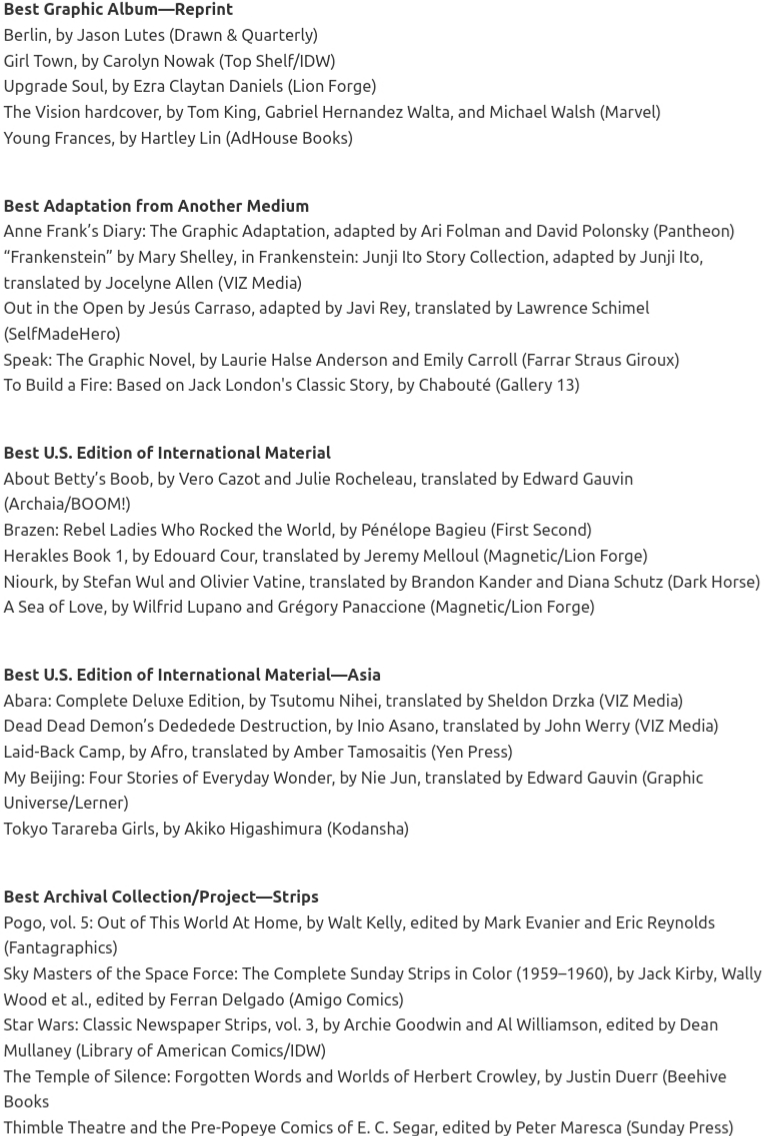 Eleven individuals are nominated for 2 Eisners: John Allison, Emily Carroll, Nick Drnaso, Mitch Gerads, Sonny Liew, Carolyn Nowak, Sean Phillips, Nate Powell, Mark Russell, Noah van Sciver, and Jen Wang.