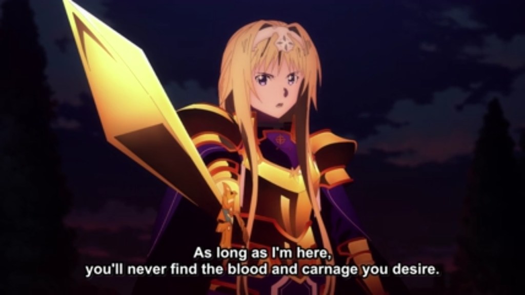 One of the most defining moments of episode two was Alice preparing for battle the Goblins and to stop the raids, the Underworld is in turmoil with the Dark Territory raiding the Human Empire and the Administrator wanting to turn the humans into Sword Golems has had the Integrity Knights struggling to pick up the pieces after what happened between Kirito, Eugeo and them.