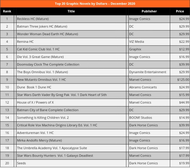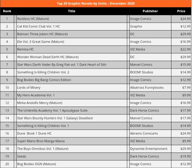 Following up on December’s NPD Bookscans Chart is now ICv2 has revealed the Top 20 Graphic Novels Chart for December, this time we’re seeing Image Comics’ Reckless taking the No. 1 spot, meanwhile DC Comics’ Batman: The Three Jokers has dropped to No. 3 (Last Month the Three Jokers was No.1 in Units Sold and by Dollars,) and their other title, Wonder Woman: Dead Earth takes the No. 6 spot in the Top 20 Graphic Novels for Units Sold. As for Manga, Junji Ito’s Remina takes the No. 5 Spot, while Yukio Sadawa’s Super Mario Manga Mania jumps in at No. 17.
